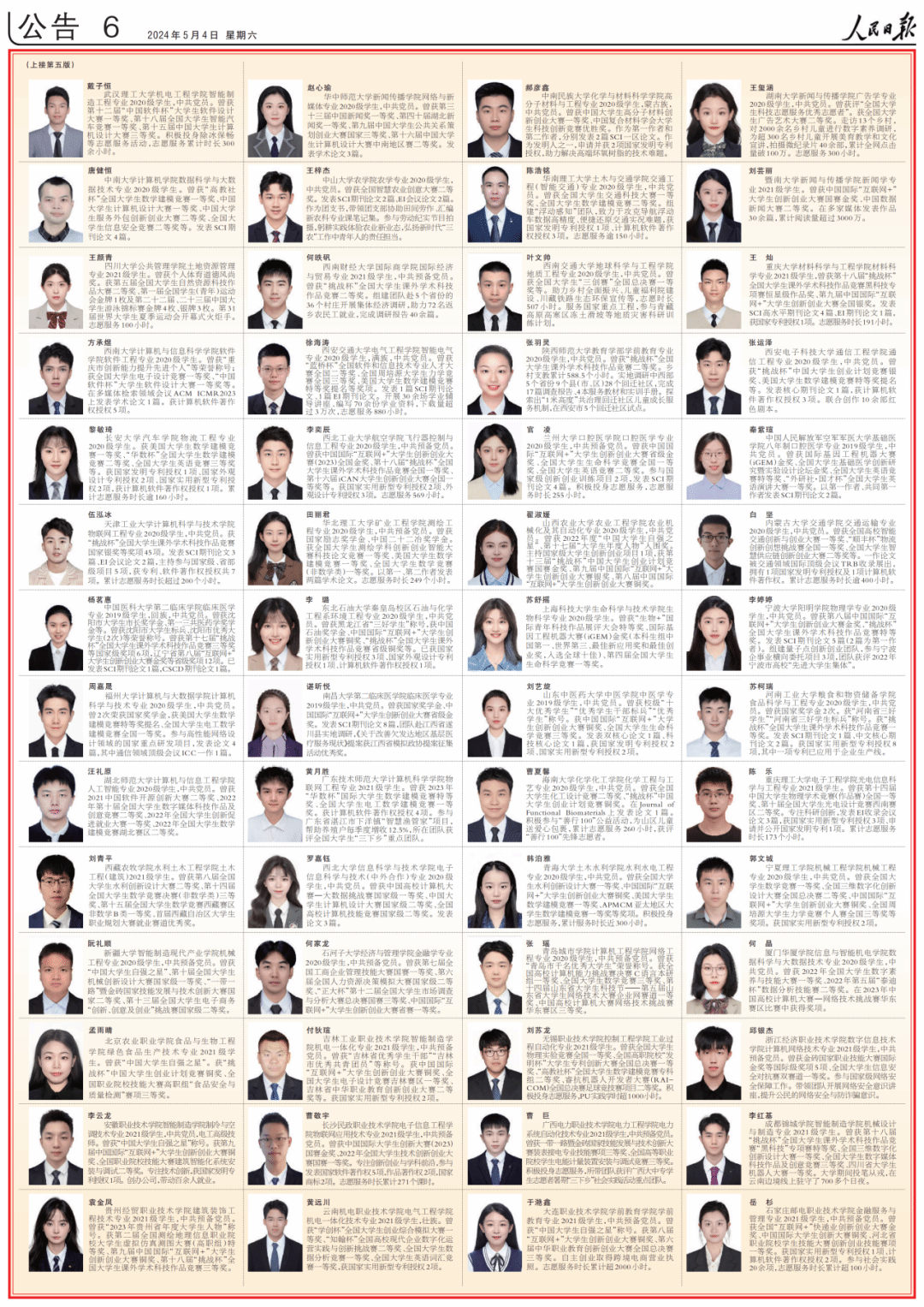 5月4日、5日出版的人民日报,用六个整版刊登了100名研究生国家奖学金获奖学生优秀代表、100名本专科生国家奖学金获奖学生优秀代表、100名中等职业教育国家奖学金获奖学生优秀代表名录。