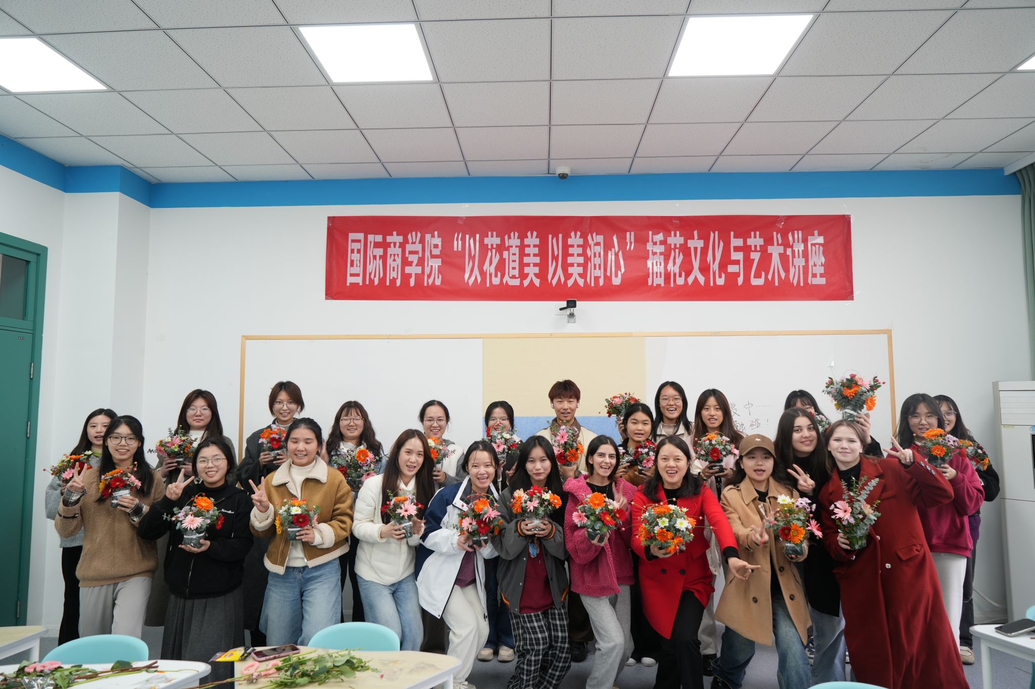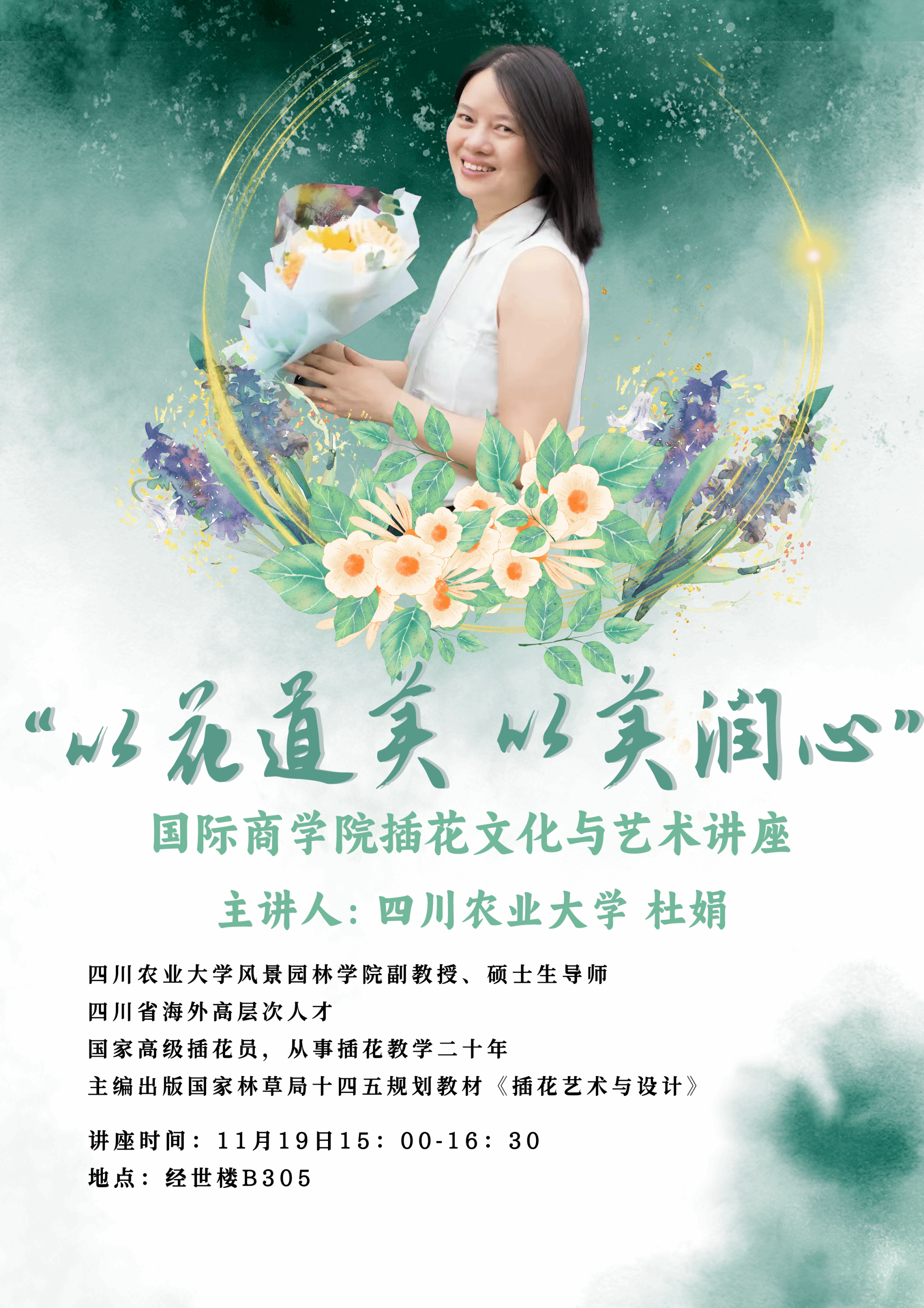 11月19日下午,“以花道美 以美润心”文化素质讲座在经世楼B305成功举办。此次讲座旨在弘扬中华优秀传统文化,深化同学们对中华花艺的认识,引导同学们在劳动实践中体悟花艺之美,浸润美好心灵。