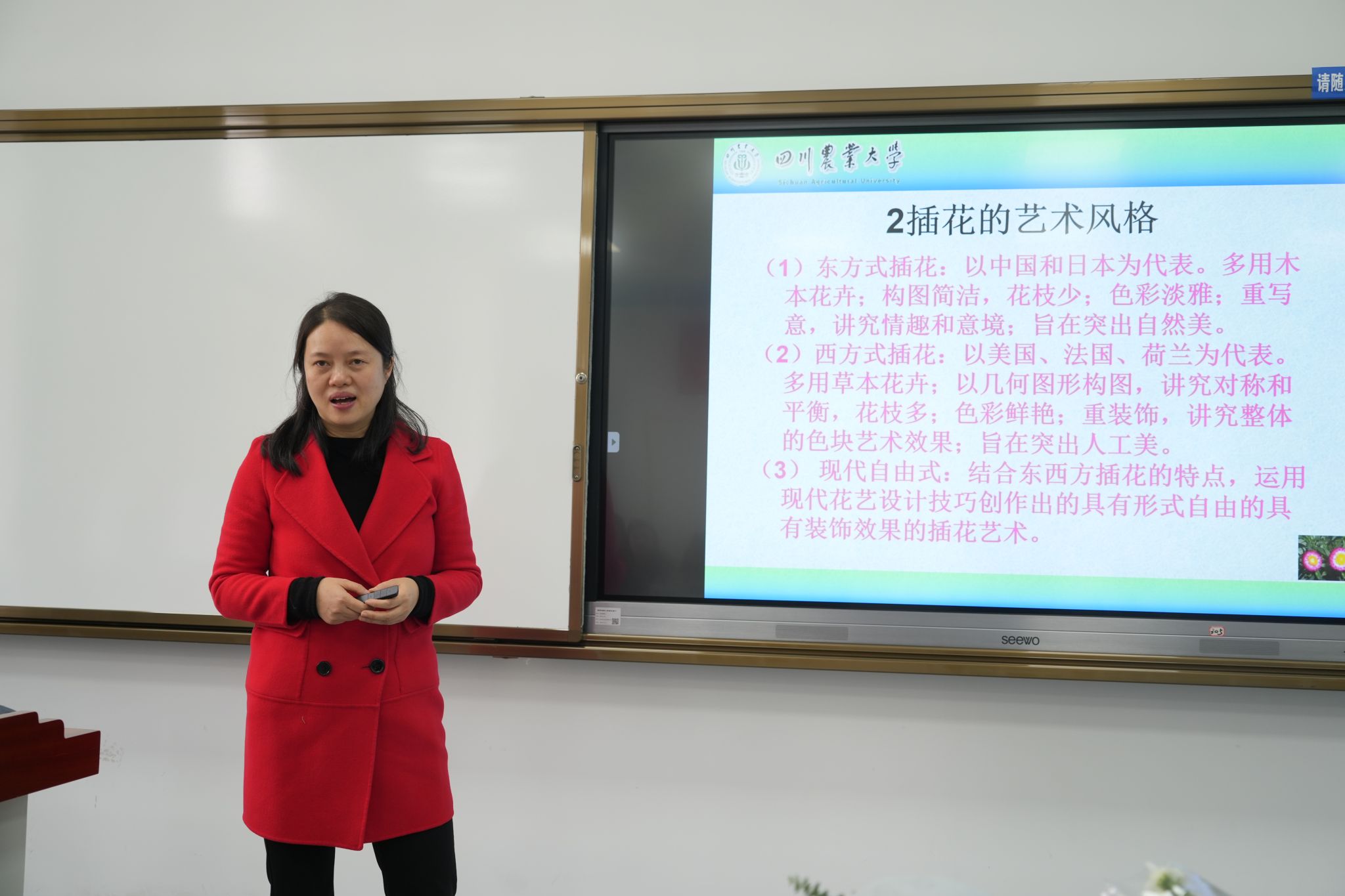 讲座邀请四川农业大学风景园林学院副教授杜娟担任主讲人。杜娟老师重点讲解了插花的三大艺术类型,日常插花花材的识别与花语,并带领同学们实操创作现代花艺作品。在实践环节,同学们在老师指导下动手包装花泥、裁剪花枝、运用插花技巧制作花束,体验插花艺术的乐趣。