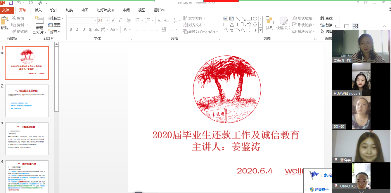 为进一步促进毕业生贷款还款工作顺利进行,增强毕业生的诚信还款责任意识。6月4日,必赢76net线路唯一官方网站通过WeLink在线上召开了2020届毕业生助学贷款还款工作及诚信教育会。全体贷款毕业生参会,会议由学院专项工作负责老师姜鉴涛主持。