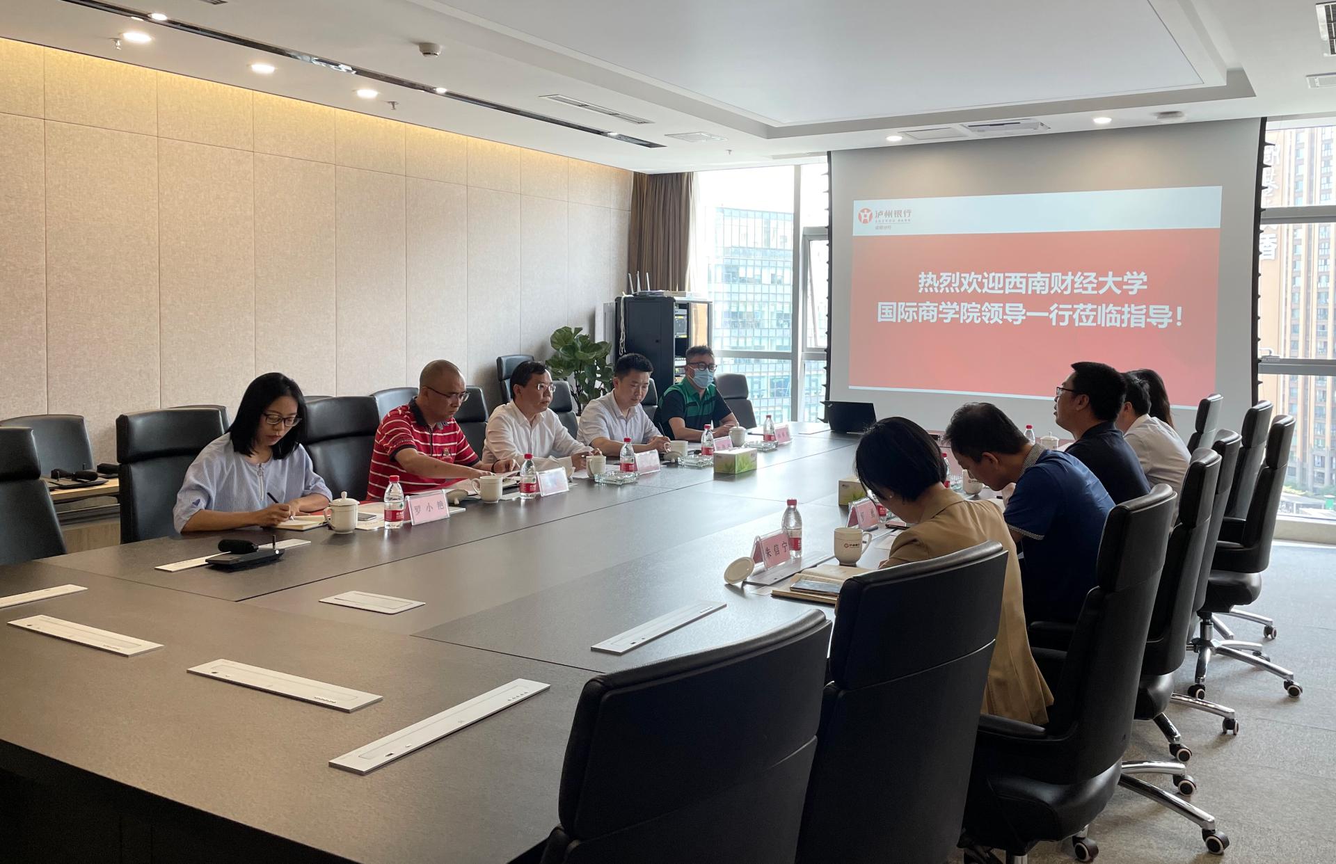 泸州银行成都分行热情接待必赢76net线路唯一官方网站一行。副行长王冲、副行长罗勇、金牛支行副行长蒲海林、国际业务部副总经理朱信宁、综合管理部经理陈新等主要管理人员参与座谈交流。王冲和罗勇详细介绍了泸州银行发展情况、用人要求及近年校园招聘。并特别感谢必赢76net线路唯一官方网站一直输送优秀毕业学子到泸州银行,目前有15名国商学子,绝大部分都已成为业务骨干。张剑波介绍了学院的人才培养特色、专业设置以及毕业生总体情况,感谢泸州银行对国商学子的选用,也希望借本次机会进一步密切院企联系,加强有效合作。自由交流环节,双方就校园招聘、实习生计划、企业家进校园、课题合作等具体内容进行了深入沟通。